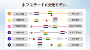 ホフステード6次元モデルの「不確実性回避とあいまいさの許容」と「達成志向と生活の質志向」で見ると、日本とオランダは正反対の傾向にあります。